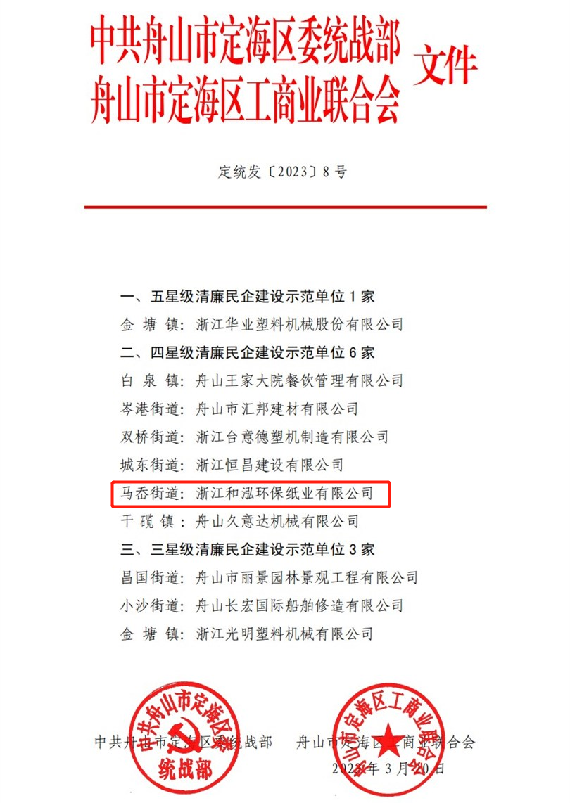 4月3日上午,全市“同心同廉·清廉民企”建設(shè)暨助力營(yíng)商環(huán)境優(yōu)化提升現(xiàn)場(chǎng)推進(jìn)會(huì)在舟山市正山智能制造科技股份有限公司會(huì)議室召開,大會(huì)對(duì)獲獎(jiǎng)單位進(jìn)行隆重通報(bào)表彰,和泓紙業(yè)榮獲“舟山市清廉民企建設(shè)示范單位”。