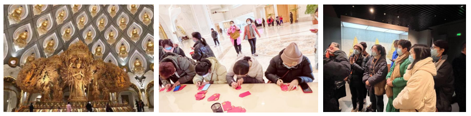 步入圣壇,大家被圣壇莊重典雅、宏偉壯觀的氣勢(shì)所震撼。一樓圓通大廳更是美輪美奐,地面正中是千手觀音佛像,跨度61.9米、高度23.7米的須彌山穹頂上260尊佛像布置在對(duì)應(yīng)的鏤空處,讓人嘆為觀止。女神們走到心愿處,紛紛寫(xiě)下祈福卡,祈禱新的一年國(guó)泰民安、平安順?biāo)?、身體健康。