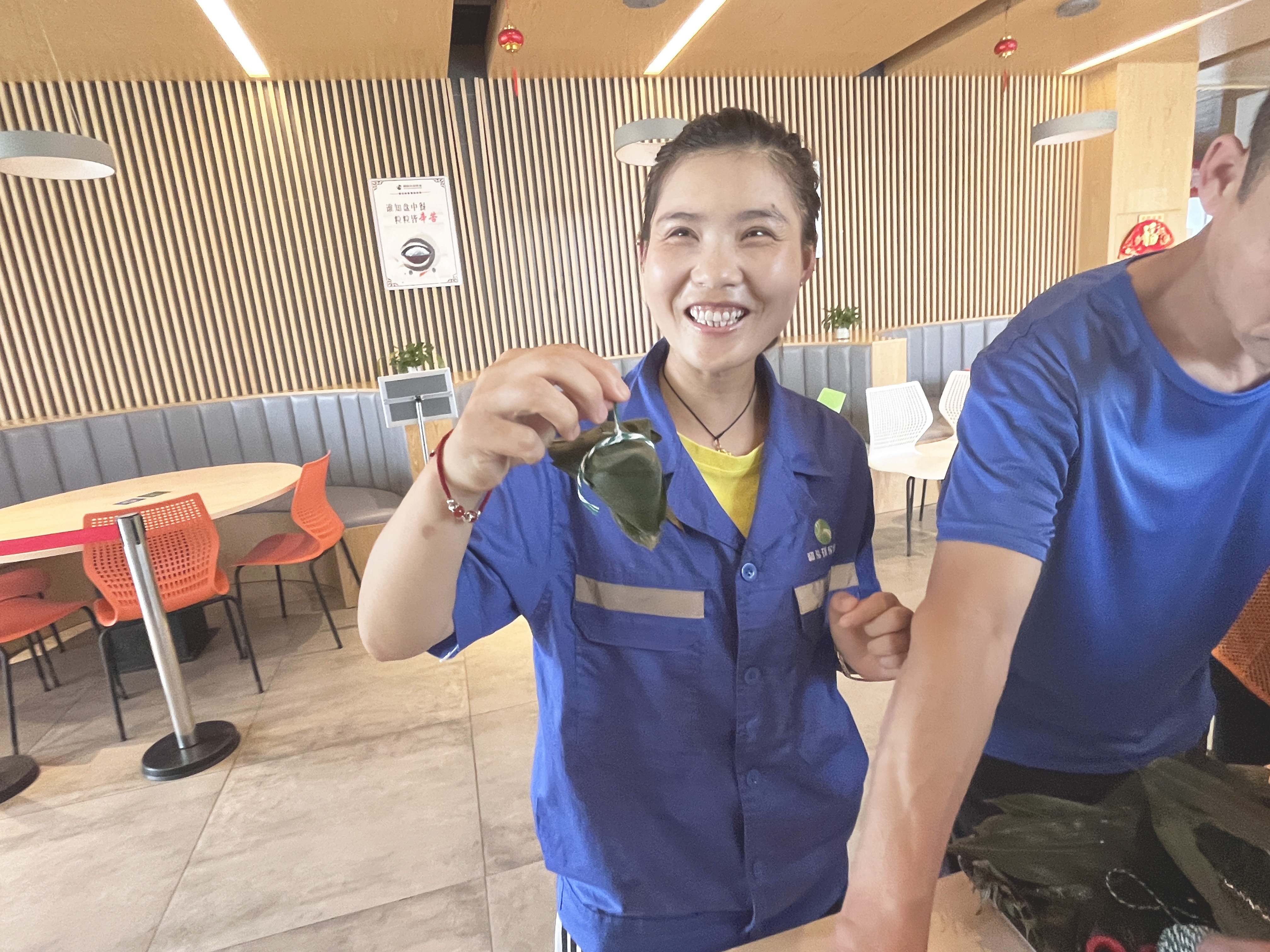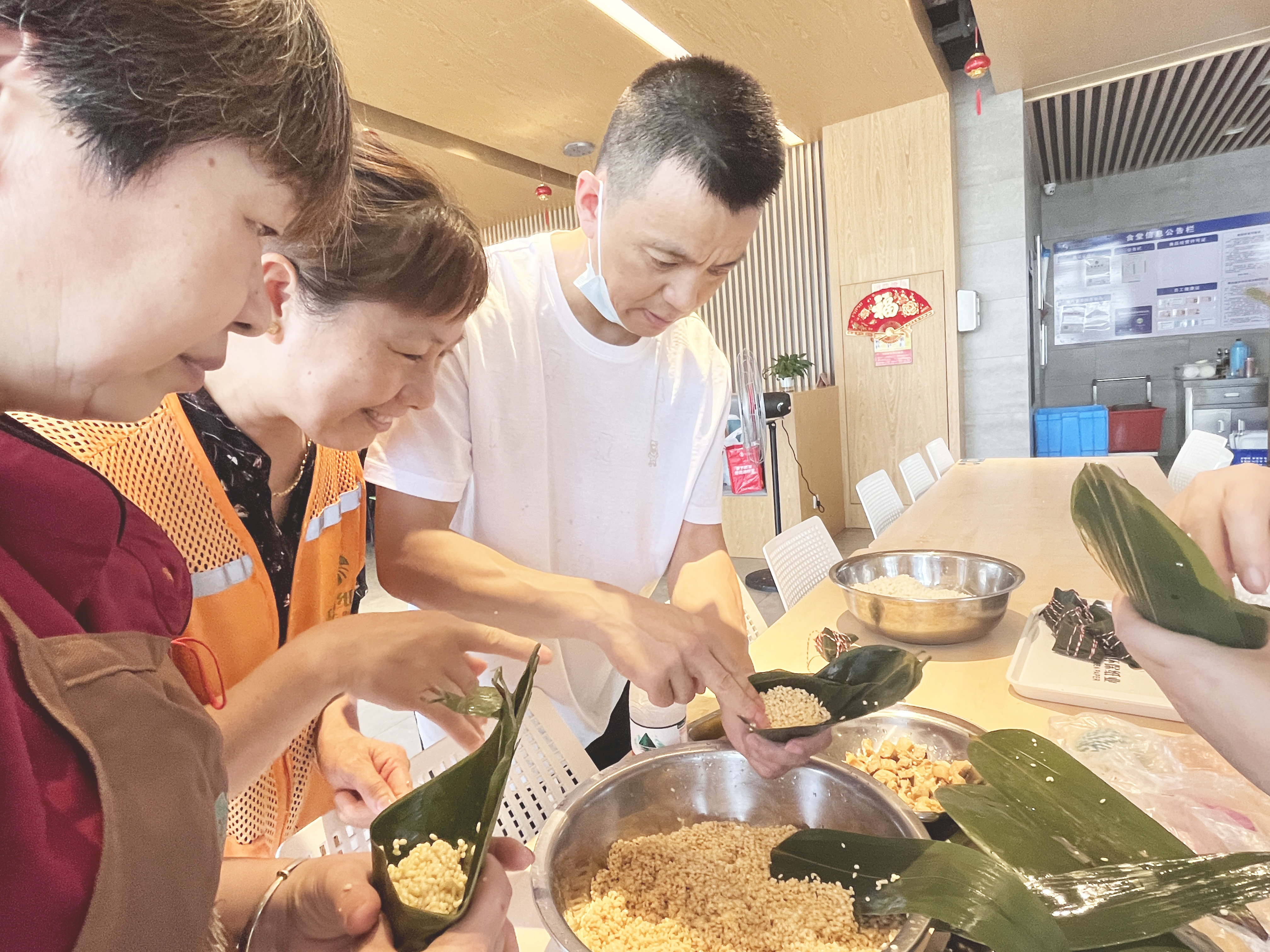 在和泓食堂內(nèi),工作人員提前做好活動(dòng)前各項(xiàng)準(zhǔn)備工作,粽子餡料有蜜棗和鮮肉,還邀請(qǐng)了食堂孫師傅作為評(píng)委兼指導(dǎo)老師。孫師傅給員工們演示了包粽子的過程,在一番講解后,大家紛紛迫不及待地動(dòng)手嘗試,許多年輕的員工感嘆平時(shí)只見過出鍋的粽子,卻從未見過包粽子的過程。眼看“熟練工”們將那寬寬長(zhǎng)長(zhǎng)的箬葉盛滿凈透了醬料的糯米后順勢(shì)裹攏,拿起麻繩三下五除二就扎緊了,可輪到自己卻是手忙腳亂,好不容易捆上一松手又沒了形狀。個(gè)別員工感嘆到“想吃個(gè)粽子真不簡(jiǎn)單,自己上手,才越發(fā)體會(huì)到這是個(gè)技術(shù)活兒!”